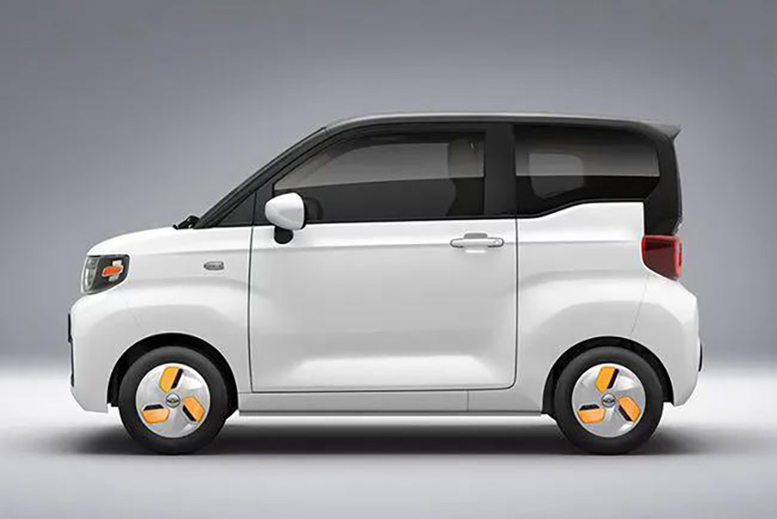 侧面比例跟五菱宏光MINI EV相仿,四轮死角的车轮布置将空间尽量留给车厢。车身轮廓延续了大部分车型方正的风格,上扬的窗线营造出运动感,拥有不错的辨识度。一条简单有力的腰线贯穿整个侧面,看起来并不会单薄。后视镜的造型比较圆润,与方正的车身形成鲜明的对比。