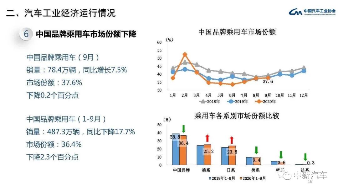 另据中汽协数据,中国品牌乘用车9月销量为78.4万辆,同比增长7.5%。市场份额为37.6%,下降0.2个百分点。1-9月销量则为487.3万辆,同比下降17.7%,市场份额为36.4%,下降2.3个百分点。
