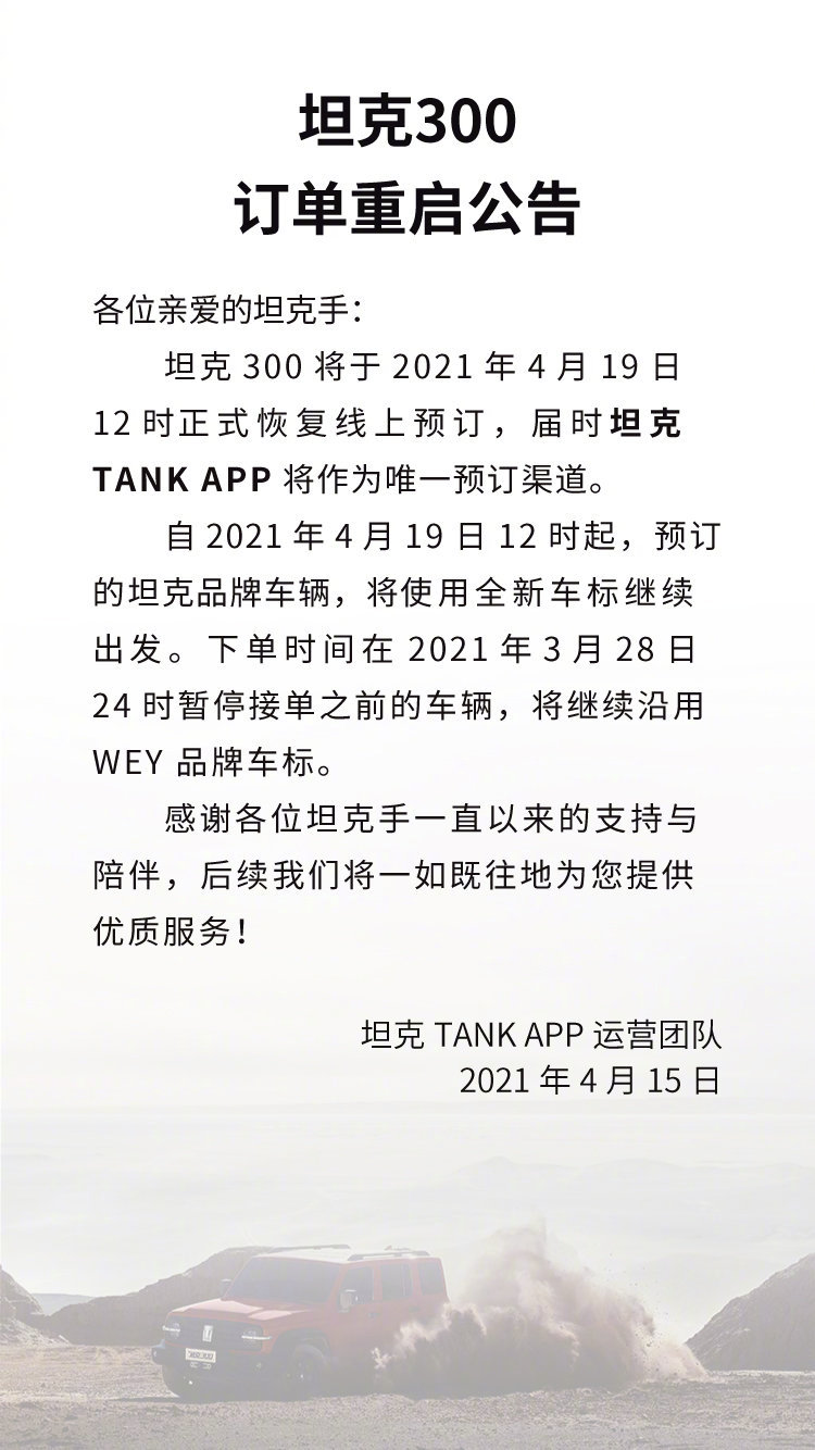 除了公布3.0T+9AT这一套动力总成之外,长城汽车随后发布了一则公告,表明坦克300将重新恢复预订。