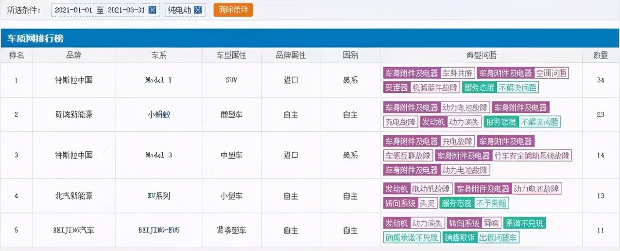 在这个榜单上奇瑞小蚂蚁排第二、北汽新能源EV系列排第四,它们的问题大多是因为电池故障、充电故障等,而北汽新能源EV系列在三个月内也连烧了四辆车,其根本原因还是自身产品做得不够好,不过人们对它们的关注度并不算高,都被特斯拉抢了“风头”。
