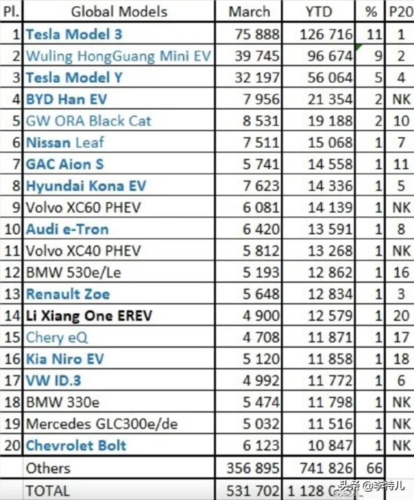 说完了中国品牌,合资品牌方面一些车型表现也相当不错,如紧日产聆风、现代 Kona EV、沃尔沃 XC60 PHEV、奥迪 e-tron不仅在一季度里销量破万,而且全部进入榜单前十。 宝马530e/le和宝马330e,也都月销破万,大众ID.3也迎来不错的市场时机,不过虽然其燃油车称霸全球,但是新能源方面,其却没有相应统治力。