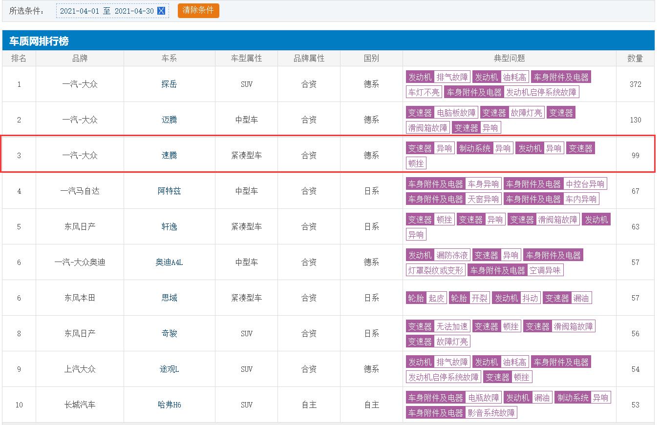 据车宇世界查询发现,从2020年1月开始,截止到2021年4月份,一汽大众速腾已经连续16个月位居车型投诉榜单前10名了。