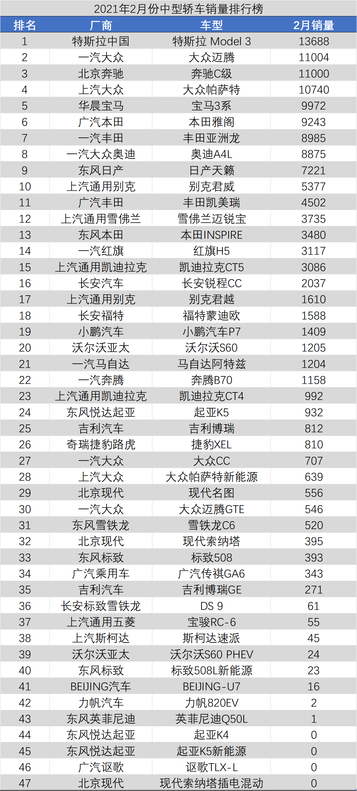 近日,乘联会公布了2021年2月份的乘用车销量,根据数据统计出了中型轿车的销量,排行,根据排行显示: 特斯拉Model3在2月...